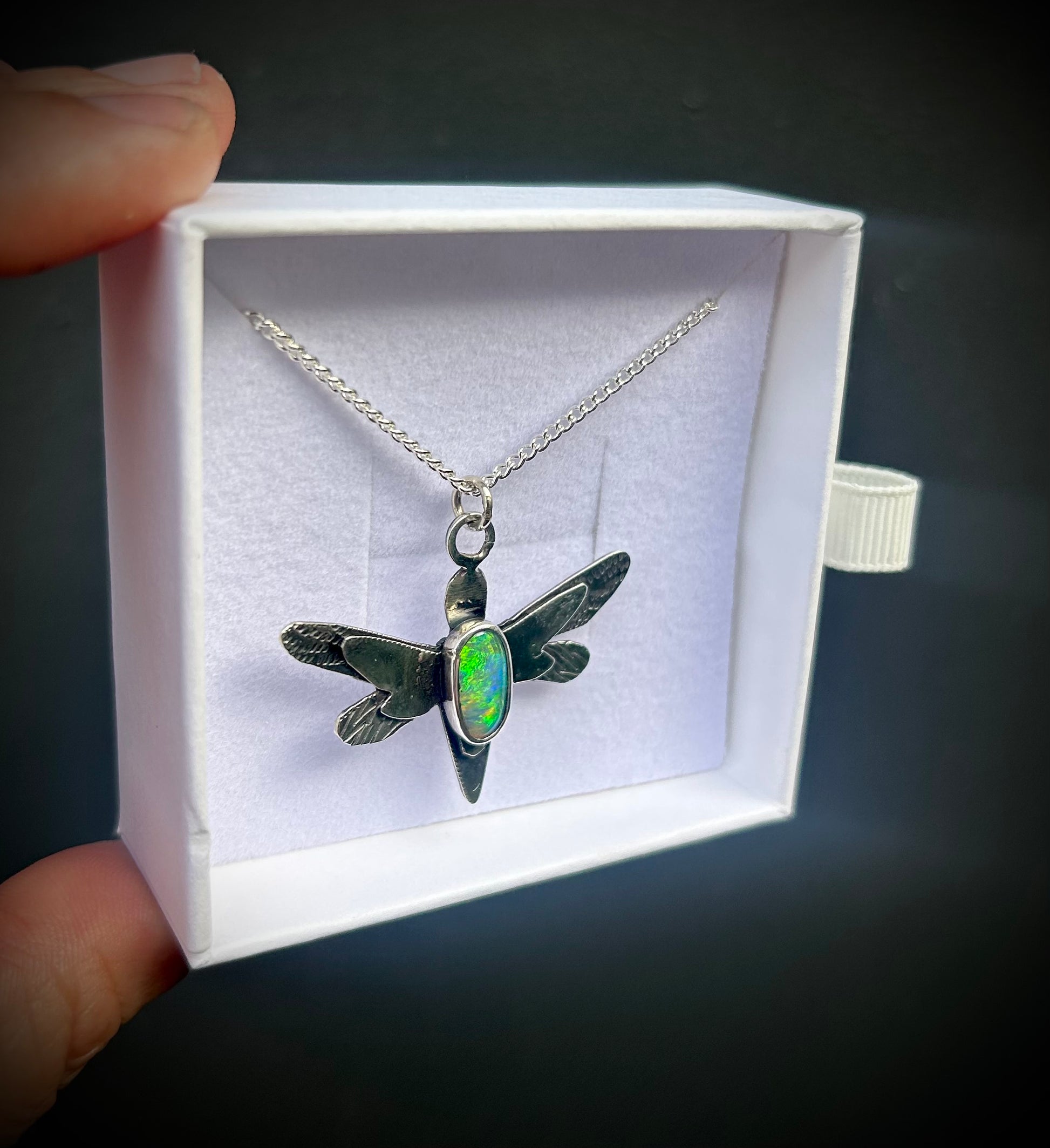 This pendant was made where the dragonflies dance, out on the opal fields, where their wings shimmer across the heat. We found this stone on one of those long, hot, dusty days, and now it's been crafted into a dragonfly as a tribute to the lightness, resilience and the beauty found in small everyday moments.