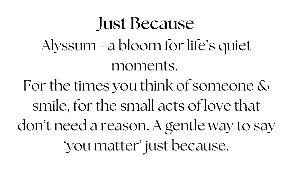 In floriography alyssum is a bloom for life quiet moments. For the times you think of someone & smile, for all of the small acts of love that don't need a reason. This is a gentle way to say 'you matter' just because..